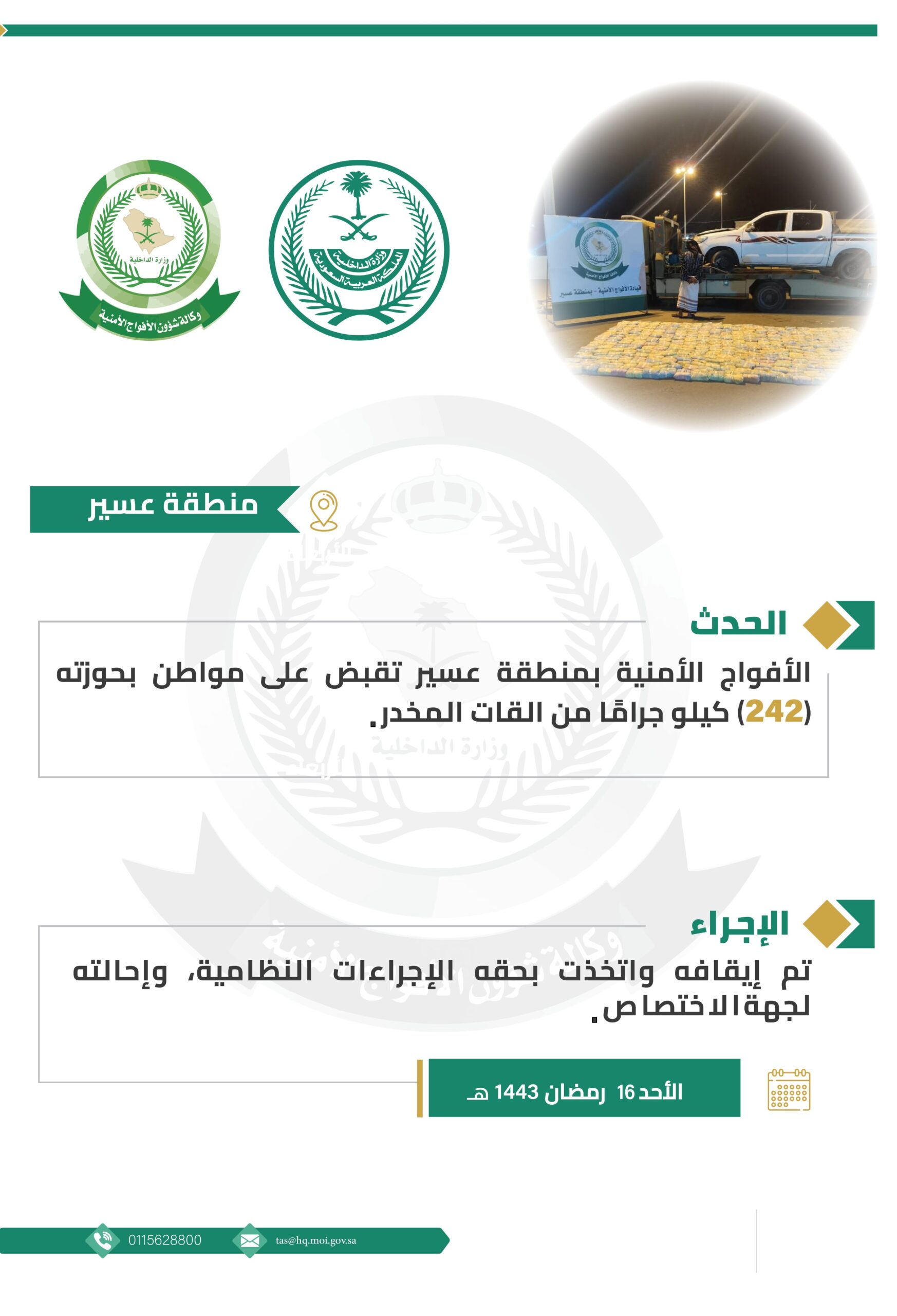 قبضت دوريات الأفواج الأمنية بمنطقة عسير على مواطن بحوزته (242) كيلو جرامًا من نبات القات المخدر، وأوقفته، واتُّخذت الإجراءات النظامية بحقه، وإحالته لجهة الاختصاص.
