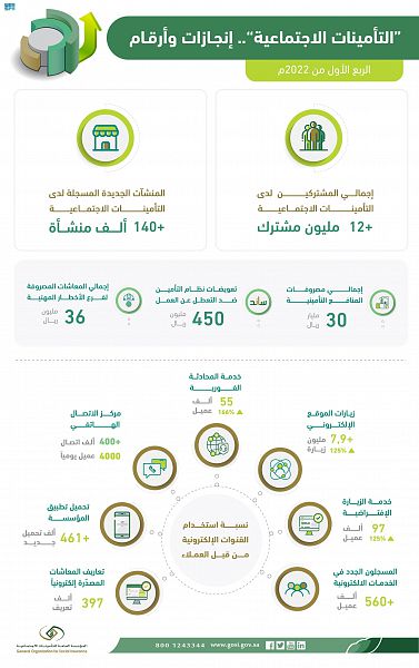 أعلنت المؤسسة العامة للتأمينات الاجتماعية بأن إجمالي مصروفات المنافع التأمينية بلغت 30 مليار ريال، كما بلغ عدد المشتركين أكثر من 12 مليون مشترك بنهاية الربع الأول لعام 2022م.