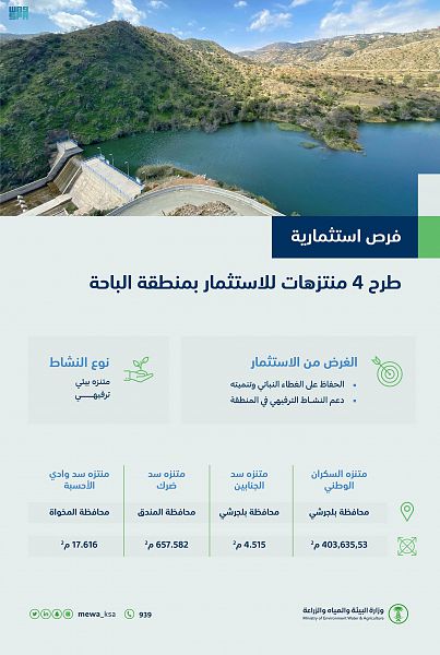 وأوضحت الوزارة أنه تم طرح متنزه السكران الوطني في محافظة بلجرشي بمساحة إجمالية تبلغ 403,635,53م2، ومتنزه سد الجنابين بالمحافظة والذي تبلغ مساحته الإجمالية المراد استثمارها 4.515م2، وكذلك متنزه سد ضرك بمحافظة المندق، بمساحة إجمالية يراد استثمارها تقدر بـ 657.582م2، بالإضافة إلى منتزه سد وادي الأحسبة بمحافظة المخواة، بمساحة تقدر بـ 17.616 م2، للراغبين بالاستثمار بالمنتزهات السياحية والترفيهية؛ بهدف تطوير المناطق المحيطة بالسدود وحمايتها، ودعم الأنشطة الترفيهية بالمنطقة، والمساهمة في المحافظة على مياه السدود بالمنطقة.