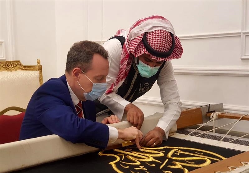 القنصل العام البريطاني يزور مجمع الملك عبدالعزيز لكسوة الكعبة.. ويشارك في حياكتها