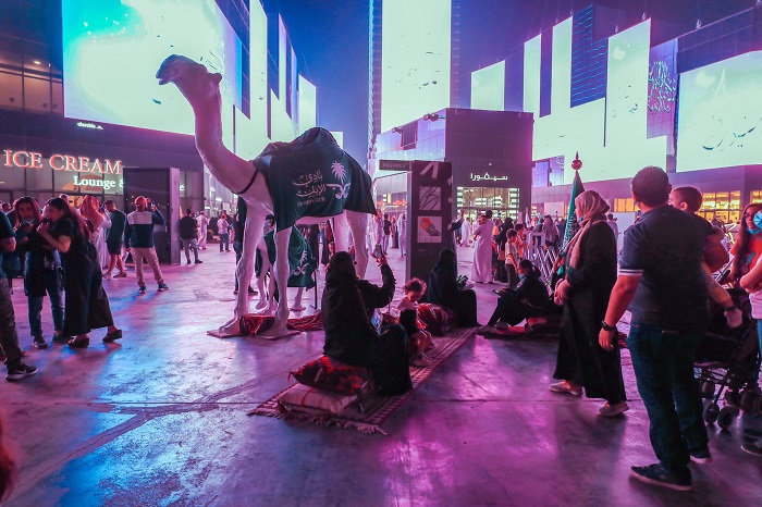 وأعطت مسيرات الهجن والهجّانة وهم متوشحين بزي المملكة العربية السعودية التراثي بعداً تاريخياً للمكان وتفاعل مع عروضهم الحيّة الجمهور من وسط ساحة النافورة.