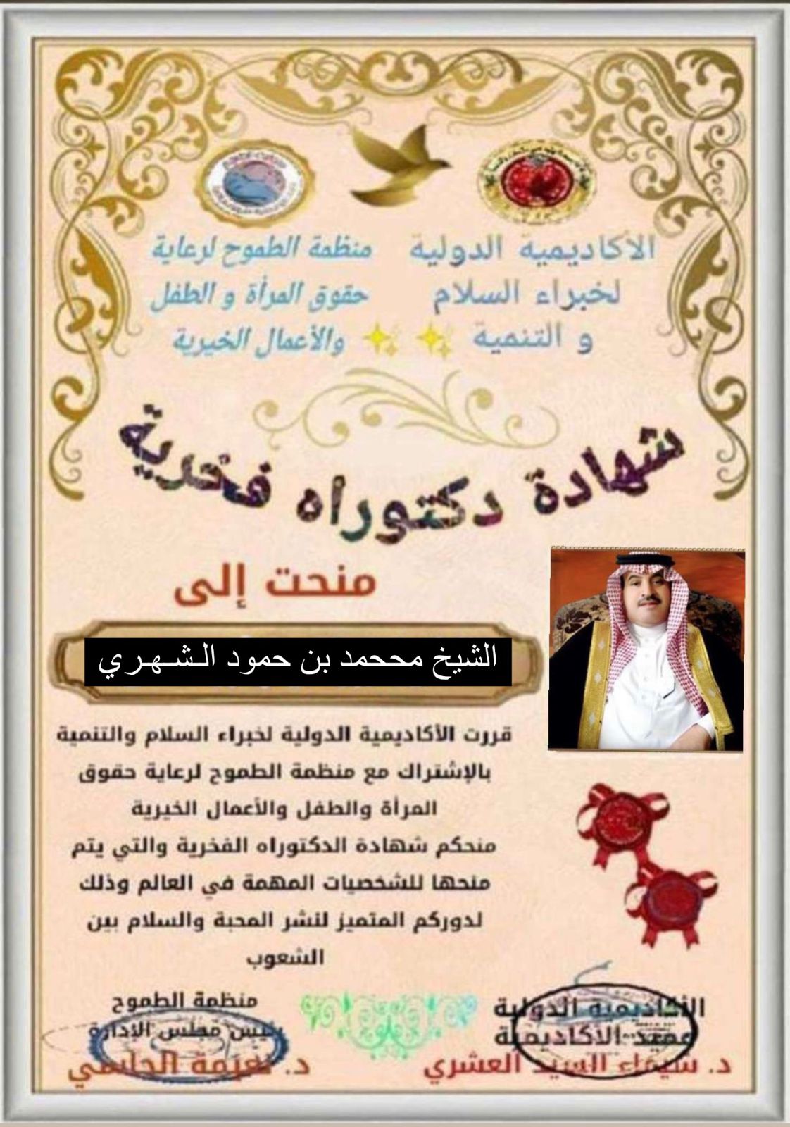 منحت الأكاديمية الدولية لخبراء السلام والتنمية، بالاشتراك مع منظمة الطموح لرعاية حقوق المرأة والطفل والأعمال الخيرية رجل الأعمال محمد بن حمود بن يتيم الشهري شهادة الدكتوراه الفكرية، والتي تمنح للشخصيات المهمة في العالم وذلك لدوره المتميز في نشر المحبة والسلام بين الشعوب.