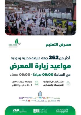 ينطلق الأحد القادم المعرض المصاحب لأعمال “المؤتمر الدولي للتعليم 2022″، الذي تنظّمه وزارة التعليم خلال المدة من 7 إلى 10 شوال 1443 هـ (8-11 مايو 2022م)، وتستمر فعالياته منذ الساعة التاسعة صباحاً وحتى التاسعة مساءً، وذلك في مركز الرياض الدولي للمؤتمرات والمعارض.