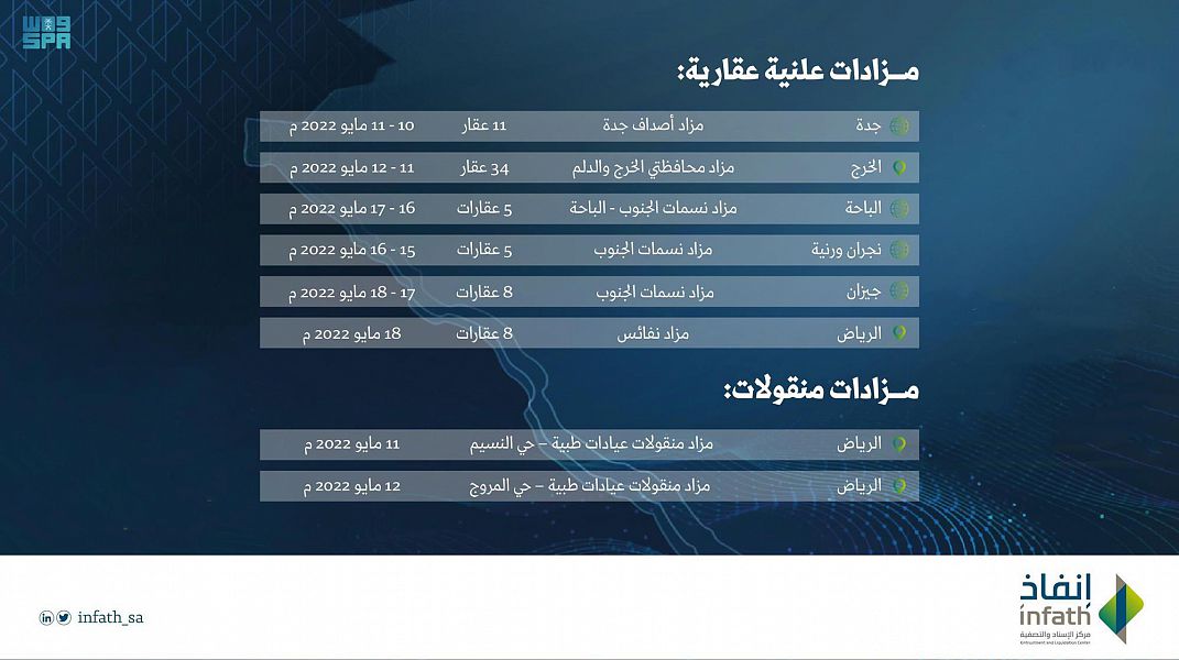 الإلكتروني (نجران ورنية) الذي يقام على 5 عقارات بعدة أحياء بمنطقة نجران، إضافة إلى مزاد نسمات الجنوب الإلكتروني (جازان) الذي يستعرض 8 عقارات، وما يخص المنقولات يقام مزادين على منقولات عيادات طبية بحي النسيم وحي المروج في الرياض، الذي يقام على 9 أصناف من الأجهزة والأدوات الطبية بأحجام وأنواع مختلفة والمفروشات والأثاث المكتبي بأصناف متعددة.