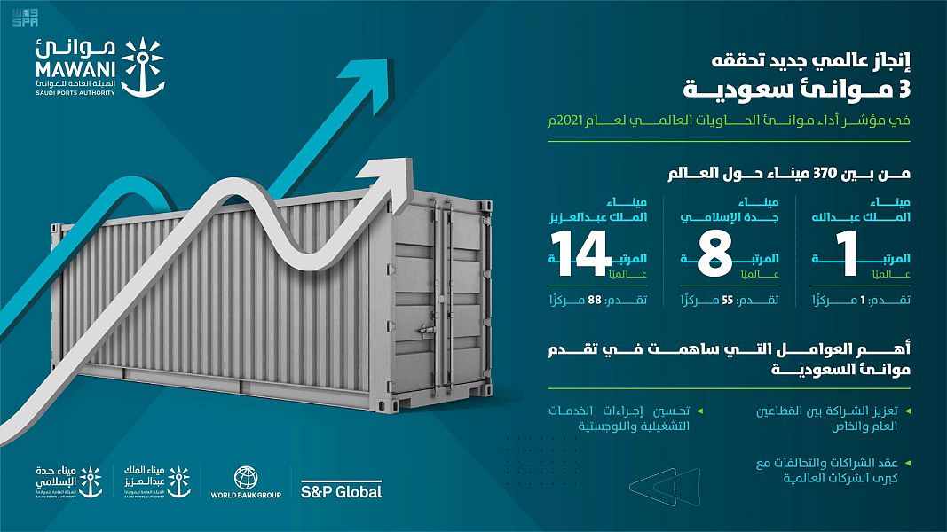 حققت موانئ المملكة الصدارة بين 370 ميناءً عالميًا بحصول ميناء الملك عبدالله على المرتبة الأولى، وميناء جدة الإسلامي على المرتبة الثامنة عالمياً، بينما أحرز ميناء الملك عبدالعزيز المرتبة الرابعة عشرة من حيث كفاءة الموانئ التشغيلية، وذلك وفق التقرير الدولي لمؤشر أداء موانئ الحاويات عالميا لعام 2021م، الذي يصدر عن البنك الدولي ومؤسسة أستاندرد آند بورز جلوبال ماركيت إنتليجانس.