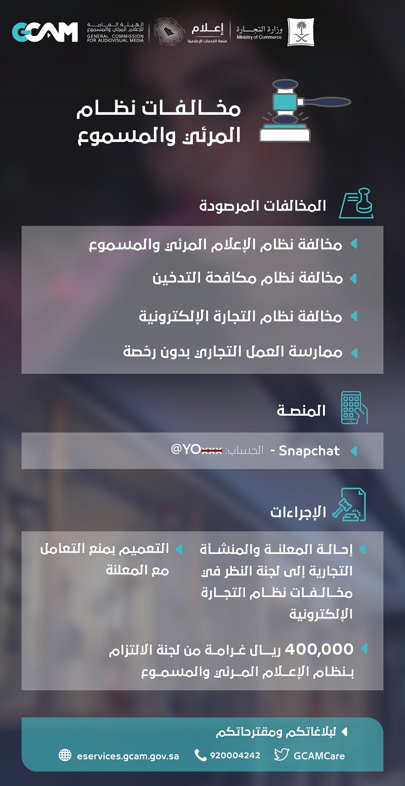 أعلنت الهيئة العامة للإعلام المرئي والمسموع اليوم إصدار غرامة بـ 400 ألف ريال على زائرة عربية وتعميما بعدم التعامل معها أو الإعلان لديها.