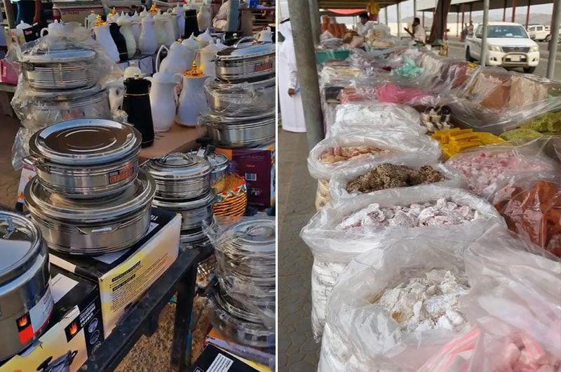 ومن خلال الجولة التي امتدت ثلاث ساعات داخل السوق اتضح لنا جليا كبر حجم ومساحات ومساحات السوق الشعبي، وتوجد عدة أقسام كالمواشي والأعلاف هو الأكبر والأنشط، وهناك قسم للمنتجات والصناعات الشعبية والتراثية كالفخار والكراسي الخشبية والمنسوجات المحلية والقطران وأدوات الحدادة والدواجن والطيور والنباتات العطرية والفواكه والخضار واللحوم والأسماك والحلوى الشعبية وأواني الطبخ والمواد الغذائية.