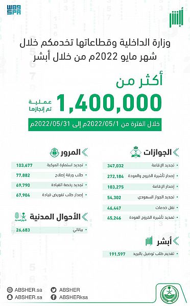 حققت وزارة الداخلية عبر منصتها الإلكترونية “أبشر” في شهر مايو الماضي من عام 2022م، العديد من الإنجازات عبر حلولها الرقمية، التي أسهمت في رفع جودة الحياة للمواطنين والمقيمين والزوار وسهلت الوصول إلى أكثر من (350) خدمة مقدمة، حيث وصل إجمالي العمليات التي نفّذها المستفيدون من “أبشر” إلى أكثر من (1,400,000)، وذلك في خدمات “تجديد الإقامة، وإصدار تأشيرة الخروج والعودة، وإصدار الإقامة، وتجديد الجواز السعودي، ونقل خدمات، وتمديد تأشيرة الخروج والعودة، وتجديد استمارة المركبة، وطلب ورقة إصلاح، وتجديد رخصة القيادة، وإصدار طلب تفويض قيادة، وتقديم طلب توصيل بالبريد وبياناتي”.