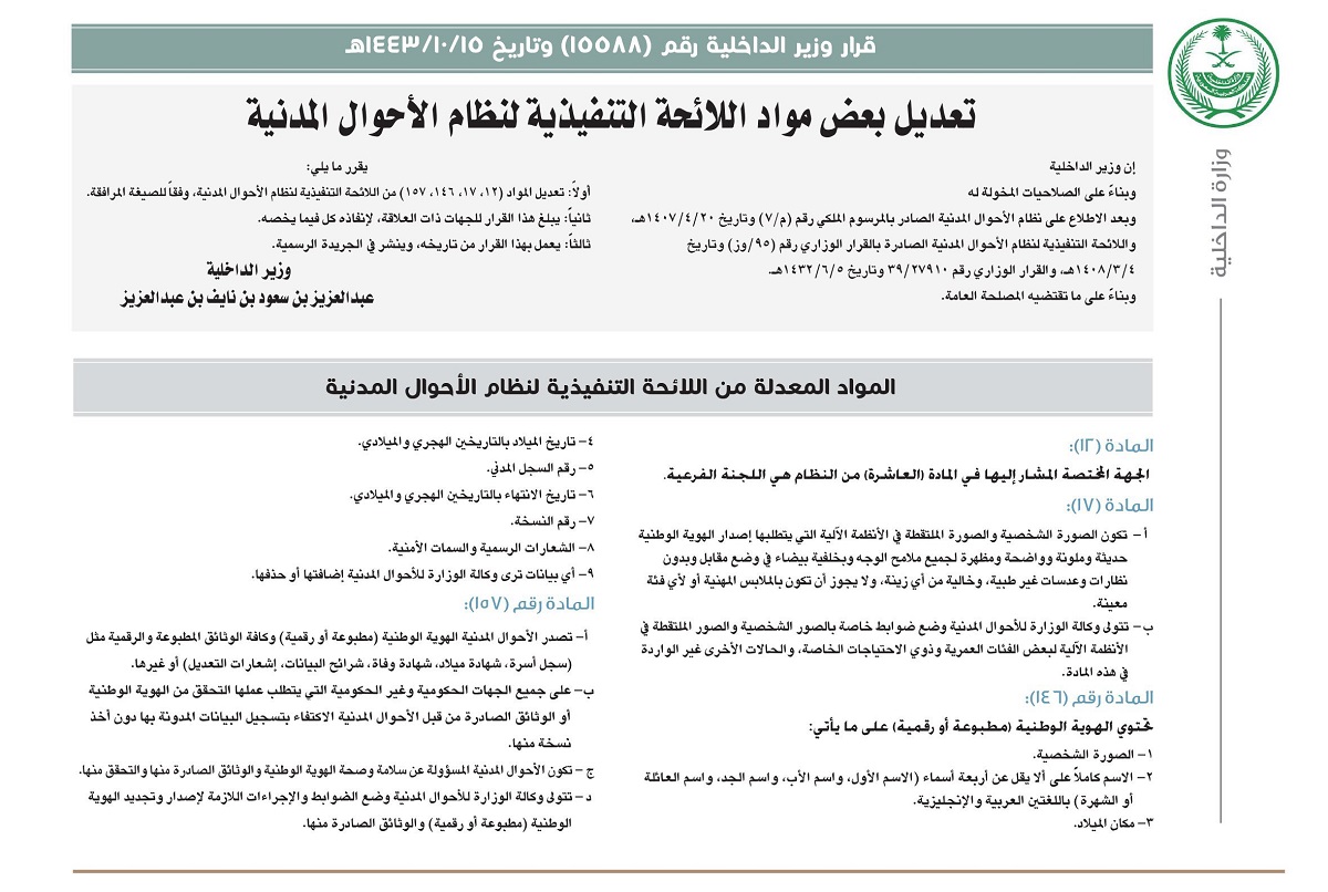 آخر الأخبار > تعديل بعض مواد في اللائحة التنفيذية بنظام الأحوال المدنية
