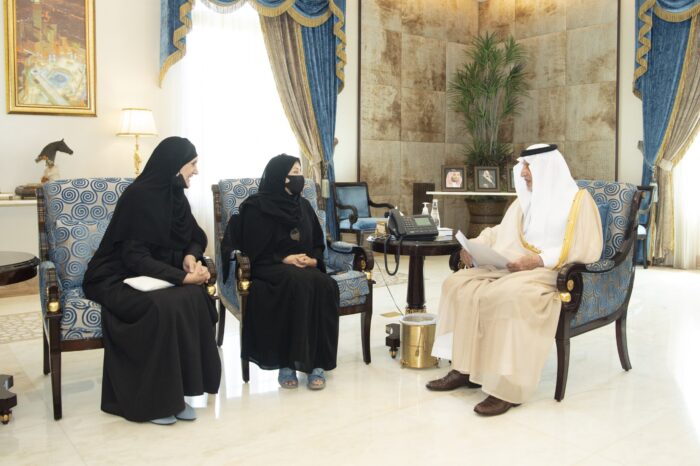 استقبل مستشار خادم الحرمين الشريفين أمير منطقة مكة المكرمة صاحب السمو الملكي الامير خالد الفيصل، في مكتبه بمقر الإمارة بجدة رئيس مجلس إدارة جمعية البيضاء للتنمية الأميرة نوف بنت فهد آل سعود، وعضو الجمعية العمومية صاحبة السمو الملكي الأميرة هيفاء الفيصل.