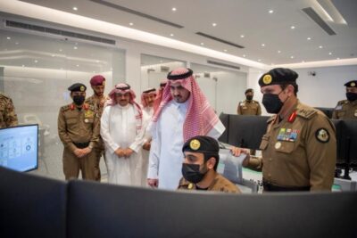 واستمع الأمير بدر بن سلطان إلى شرح عن الأعمال التي يؤديها المركز، ومن بينها استقبال البلاغات والتعامل معها ومتابعة ورصد جميع الخطط الأمنية والمرورية والتنظيمية بأكثر من 8000 كاميرا مراقبة.