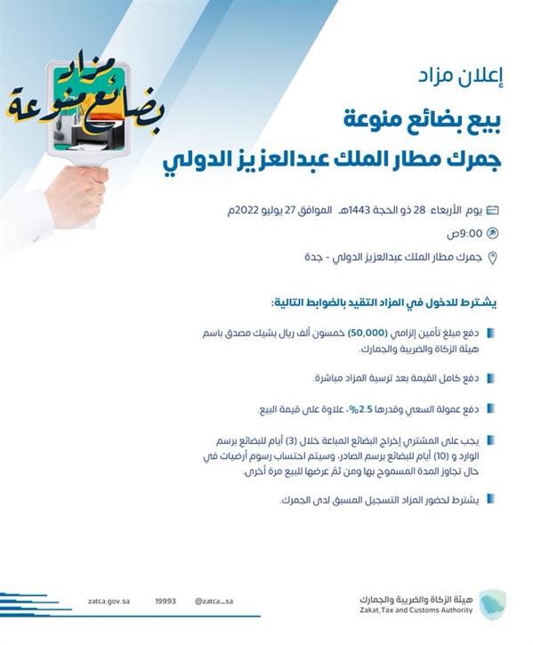 أعلنت هيئة الزكاة والضريبة والجمارك، اليوم (الخميس)، إقامة مزاد علني لبيع بضائع منوعة في جمرك مطار الملك عبدالعزيز.
