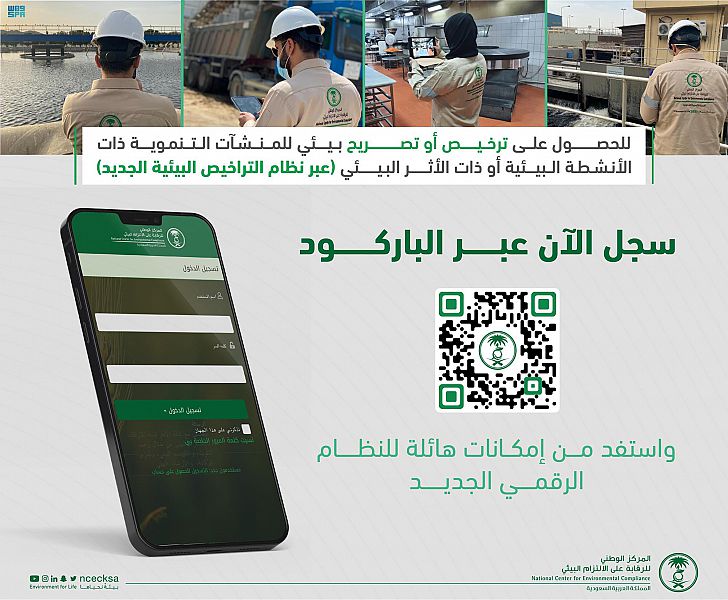 وحث الجهات والمنشآت التنموية ذات الأثر البيئي كافة على التسجيل في نظام التصاريح الرقمي عبر الرابط: https://ecompliance.ncec.gov.sa/NCEC/Welcome.aspx, مؤكداً توفير الدعم على مدار الساعة عبر الرقم 988 أو الإيميل support-ncec@ncec.gov.sa.