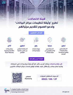 دعت هيئة الاتصالات وتقنية المعلومات العموم لتقديم مرئياتهم حول “وثيقة تنظيمات مراكز البيانات”، وذلك ضمن مبادراتها الهادفة إلى مواكبة التطور المتسارع في قطاع الاتصالات وتقنية المعلومات وتمكين التحول الرقمي لجميع القطاعات في المملكة.