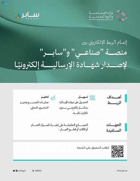 أعلنت وزارة الصناعة والثروة المعدنية والهيئة السعودية للمواصفات والمقاييس والجودة أتمتة عمليات الربط الإلكتروني بين منصتَيْ “سابر” و “صناعي” الإلكترونيتين؛ بهدف تسهيل الحصول على شهادة الإرسالية لاستيراد المواد الخام والآلات والمعدات وقطع الغيار للمصانع الوطنية الحاصلة على الإعفاء الصناعي إلكترونياً، بما يسهم في دعم عمليات التصنيع وتعزيز المحتوى المحلي.