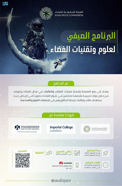 تنظِّمُ الهيئةُ السعوديةُ للفضاء البرنامجَ الصيفي لعلوم وتقنيات الفضاء حضورياً في الرياض بالتعاون مع Imperial College London وThunderbird School of Global Management، وذلك خلال الفترة (14 أغسطس – 25 أغسطس) في مركز هواوي لفضاء المستقبل، حيث يهدف البرنامج إلى رفع المعرفة وتنمية مهارات الطلاب الجامعيين في مجال الفضاء وعلومه، من خلال دورات تدريبية يقدمها مختصون في علوم الفضاء.