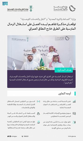 وقّعت وزارة الصناعة والثروة المعدنية مذكرة تفاهم مع وزارة النقل والخدمات اللوجستية؛ لاستغلال الرمال المتحركة المترسبة على الطرق كنتيجة للظروف المناخية ويترتب منها تأثير سلبي في الطرق.