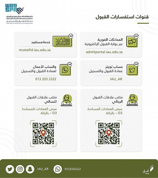وأوضح عميد القبول والتسجيل بجامعة الإمام عبدالرحمن بن فيصل الدكتور عبدالله آل مريح أن أعمال القبول في الجامعة تسير وفق خطط مرسومة، تعمل على توفير الدعم للمتقدمين عبر القنوات الرسمية على مدار الساعة للرد على استفسارات المتقدمين، وذلك سعياً لتحسين تجربة المتقدم للقبول من حيث سهولة الوصول وسرعة الاستجابة وكفاءة عملية التقديم واختصار الكثير من الوقت وتحقيقاً للعدالة بين الجميع ومراعاة لظروف المتقدمين، مشيراً إلى أهمية متابعة قنوات التواصل الاجتماعي الرسمية الخاصة بالجامعة وعمادة القبول والتسجيل للحصول على المعلومة من مصدرها الموثوق والاطلاع على النشرات والرسائل التي ترسل عبر هذه المنصات من الحساب الموحد IAU_AR@ أو من خلال موقع الجامعة الرسمي.