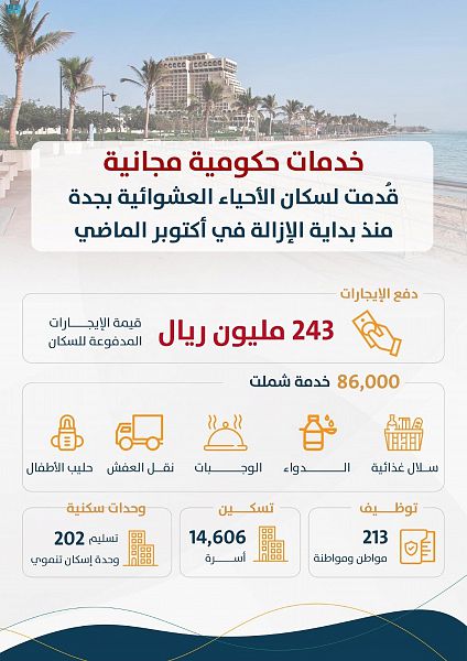 أعلنت لجنة الأحياء العشوائية بمحافظة جدة أنه تم دفع الإيجار لما يزيد عن 14 ألف أسرة من سكان الأحياء العشوائية، بقيمة تتجاوز 243 مليون ريال منذ بدء المشروع في أكتوبر الماضي وحتى اليوم .
