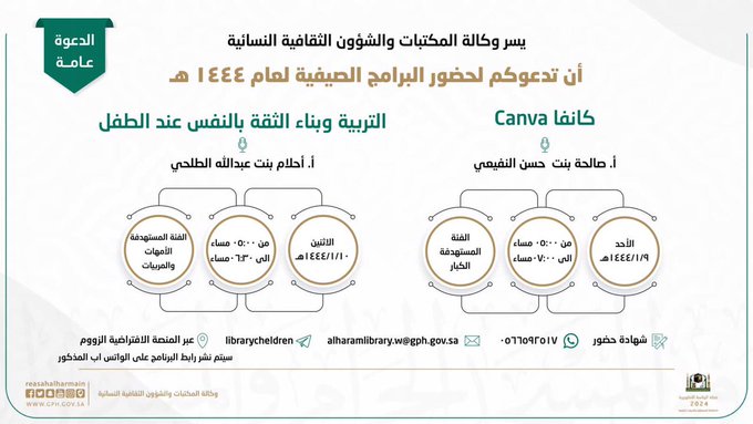 وبينت سعادتها بأن برامج الأسبوع الثاني من شهر محرم لعام 1444هـ, ستتضمن : “برنامج Canva” من تقديم سعادة الأستاذة صالحة بنت حسن النفيعي، و”التربية وبناء الثقة بالنفس عند الطفل” ستقدمه سعادة الأستاذة أحلام بنت عبدالله الطلحي.