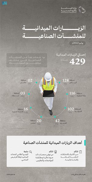 نفذت وزارة الصناعة والثروة المعدنية ممثلة في الإدارة العامة لمراكز الخدمة الصناعية الشاملة وإدارة الالتزام “429” زيارة ميدانية على المنشآت الصناعية في عدد من مناطق المملكة خلال شهر يوليو الماضي، من بينها 128 زيارة على المصانع في منطقة الرياض، و116 في منطقة مكة المكرمة و102 زيارة على المصانع في المنطقة الشرقية.