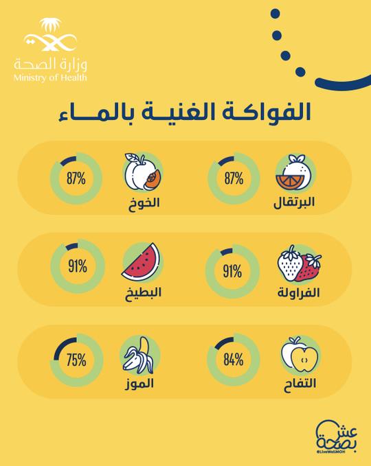 ونوهت إلى أن الفواكه خيار صحي كوجبة خفيفة، موضحةً أن الفواكه الغنية بالماء تشمل البرتقال والخوخ بنسبة 87%، والفراولة والبطيخ بنسبة 91%، والتفاح بنسبة 84%، والموز بنسبة 75%.