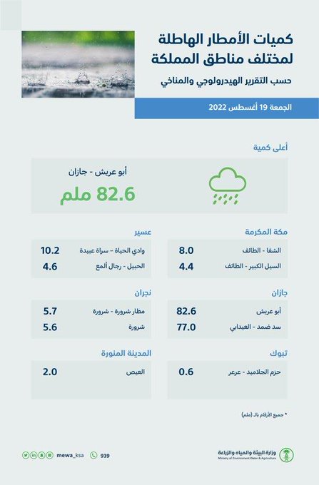 وبلغ معدل الهطول في ضمد 18.0 ملم، والعارضة 14.4ملم، والطوال 12.4ملم، ووادي الحياة بسراة عبيدة 10.2 ملم