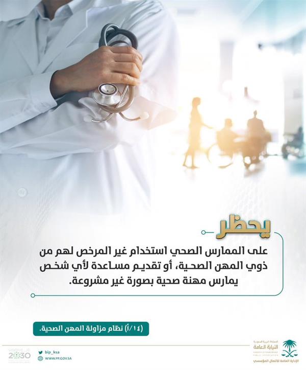 وشددت النيابة العامة، على أنه يُحظر على الممارس الصحي استخدام غير المُرخص لهم من ذوي المهن الصحية، أو تقديم مساعدة لأي شخص يمارس مهنة صحية بصورة غير مشروعة، وذلك وفقاً لنظام مزاولة المهن الصحية.