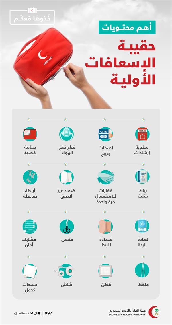 كشفت هيئة الهلال الأحمر السعودي، عن أهم محتويات حقيبة الإسعافات الأولية، منوهة بضرورة اصطحابها في كل مكان.