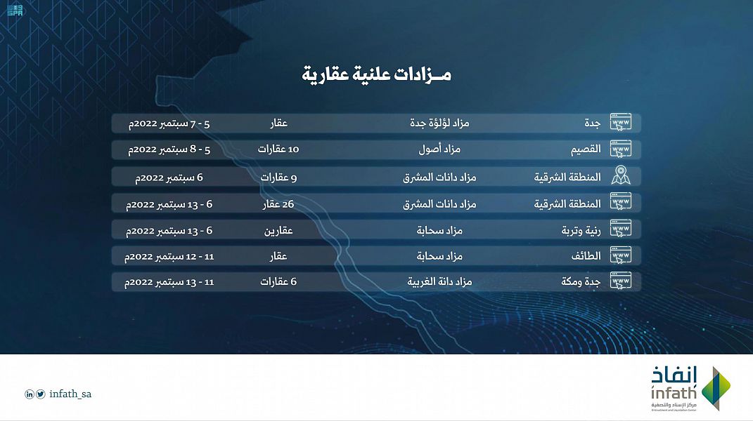 وتبدأ بمزاد لؤلؤة جدة الإلكتروني الذي يعرض عقارًا في مدينة جدة، ومزاد أصول الإلكتروني الذي يعرض 10 عقارات بمنطقة القصيم، ومزاد دانات المشرق الإلكتروني الذي يعرض 26 عقارًا بالمنطقة الشرقية، ومزاد دانات الشرقية الحضوري الذي يعرض 9 عقارات بالمنطقة الشرقية، ومزاد سحابة الإلكتروني الذي يعرض عقارين في كلٍ من محافظتي رنية وتربة، ومزاد سحابة الطائف الإلكتروني الذي يعرض عقارًا بمدينة الطائف، وأخيرًا مزاد دانة الغربية الإلكتروني الذي يعرض 6 عقارات في مدينتي مكة المكرمة وجدة، كما يمكن الاطلاع على صفحة المزادات من خلال الرابط التالي : https://infath.sa/auctions .