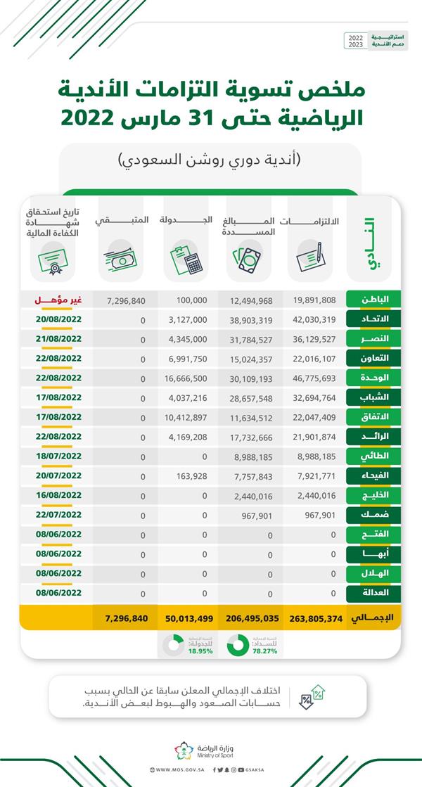 أعلنت وزارة الرياضة، مساء اليوم الإثنين، عن تفاصيل ما تم سداده من الالتزامات المالية على أندية دوري روشن السعودي واجبة السداد حتى 31 مارس 2022.