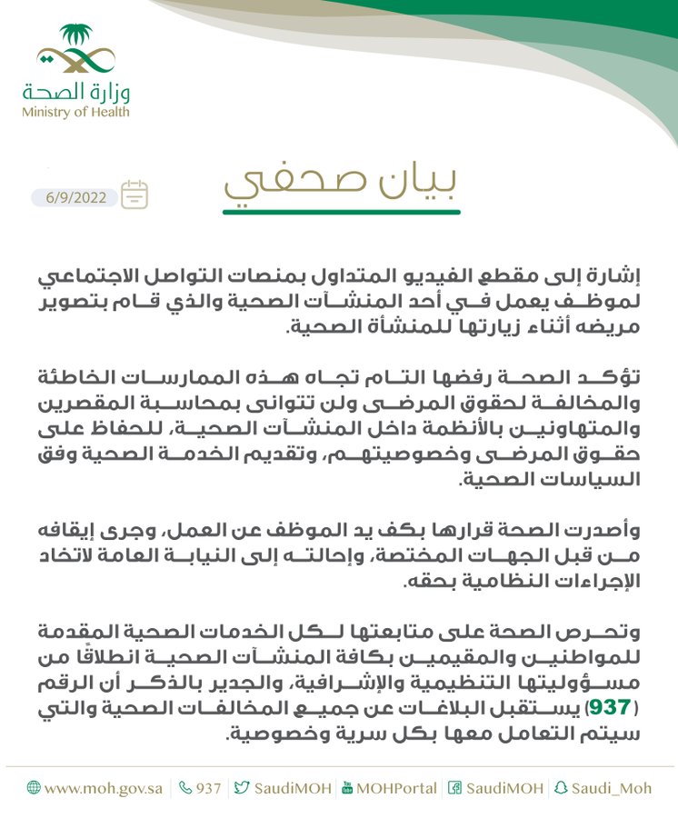 أصدرت وزارة الصحة بيانا صحفيا عن الفيديو المتداول بمنصات التواصل الاجتماعي لموظف يعمل فـي أحد المنشـات الصحية والذي قام بتصوير مريضه أثناء زيارتها للمنشأة الصحية.