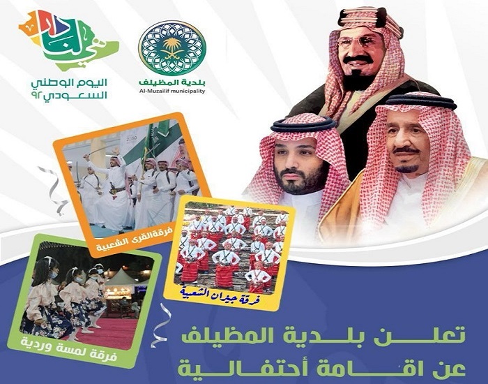 تقوم بلدية المظيلف مساء اليوم السبت حفلها بمناسبة ذكرى اليوم الوطني الثانية والتسعين للمملكة العربية السعودية، وذلك بساحة الاحتفالات بكورنيش المظيلف.
