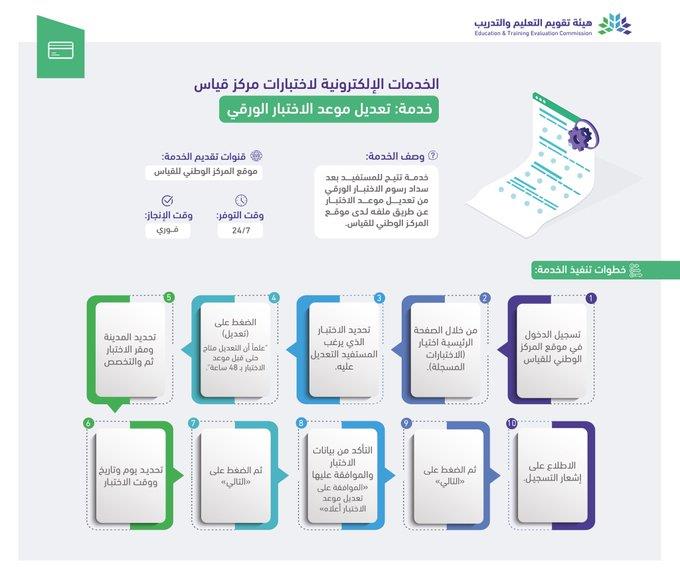 وبيّنت الهيئة، أن الخطوات تتضمن تسجيل الدخول في موقع المركز الوطني للقياس، واختيار الاختبارات المُسجلة من خلال الصفحة الرئيسية، وتحديد الاختبار الذي يرغب المُستفيد التعديل عليه، والضغط على (تعديل) علماً بأن التعديل متاح حتى قبل موعد الاختبار بـ48 ساعة.