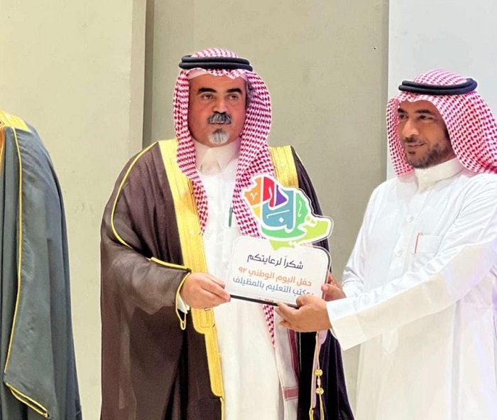 وبدأ الاحتفاء بافتتاح المعارض الفنية المصاحبة، ومن ثم الحفل الخطابي الذي بدأ بالنشيد الوطني، ومن ثم توالت فقرات الحفل الخطابي التي بدأت بتلاوة آيات من الذكر الحكيم، فكلمة مدير مكتب التعليم بالمظيلف رفع خلالها التهاني لمقام خادم الحرمين الشريفين وولي عهده الأمين بهذه المناسبة الغالية على كل مواطن ومواطنه، وقدم شكره لجميع الجهات المشاركة في الاحتفاء ولجميع الطلاب والطالبات والمعلمين والمعلمات ولمديري ومديرات المدارس والمشرفين والمشرفات.