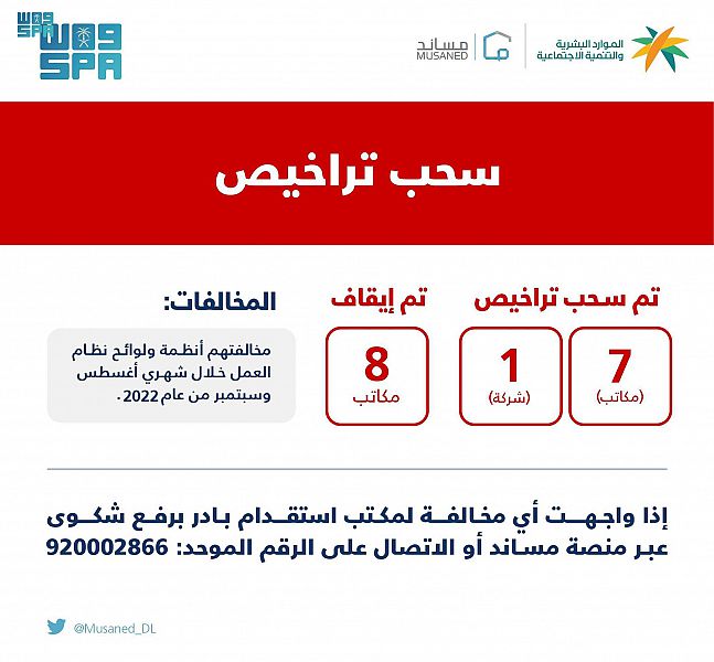 أصدرَت وزارة الموارد البشرية والتنمية الاجتماعية قرارًا بسحب تراخيص 7 مكاتب وشركة استقدام، وإيقاف نشاط 8 مكاتب حتى حل الشكوى المرفوعة؛ لمخالفتهم أنظمة ولوائح نظام العمل خلال شهر أغسطس وسبتمبر من عام 2022م.