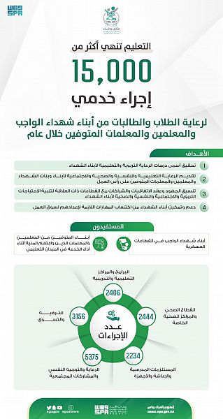 أنهت وزارة التعليم 15,615 إجراءً خدمياً لرعاية الطلاب والطالبات أبناء شهداء الواجب والمعلمين المتوفين أثناء عملهم في 47 إدارة تعليم، عبر 5 مجالات خدمية على مدى عام 2021، وذلك من خلال مكاتب “وفاء” الفرعية في مناطق ومحافظات المملكة؛ تعزيزاً لدورها في خدمة ذوي شهداء الوطن، وعرفاناً ووفاءً لذوي المعلمين والمعلمات الذين وافتهم المنية وهم يؤدون رسالة التعليم.