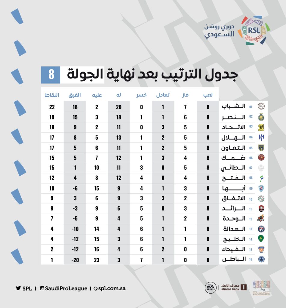 اختتمت مساء الأحد، منافسات الجولة الثامنة من بطولة دوري روشن السعودي، بعد مباريات قوية، كان آخرها فوز الاتحاد على نظيره الوحدة بهدف نظيف، ليحتل المركز الثالث في جدول ترتيب المسابقة.
