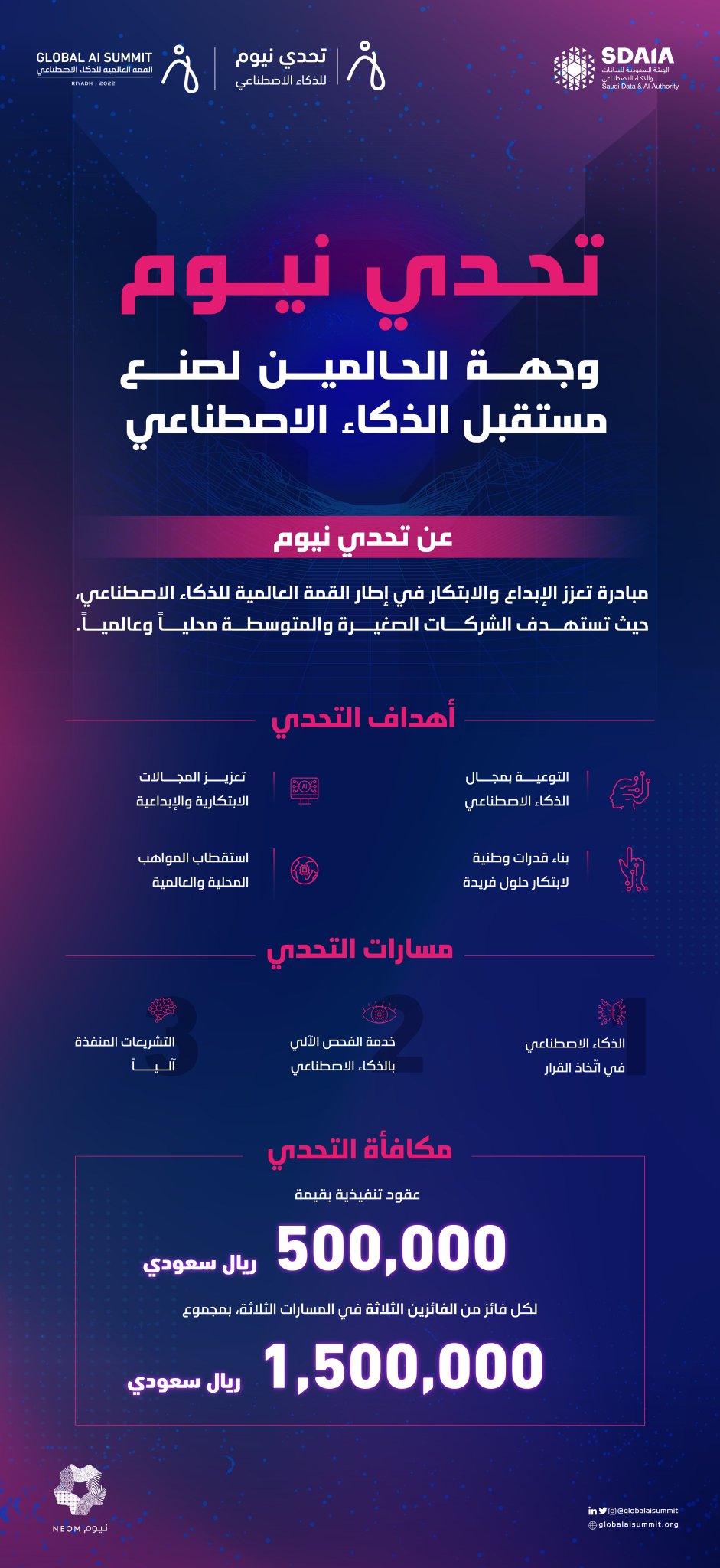 ويمكن للراغبين في الالتحاق بمنافسات تحدي نيوم التسجيل والاطلاع على معلومات التحدي عبر الرابط التالي: https://neom.globalaisummit.org/ar/index.aspx .
