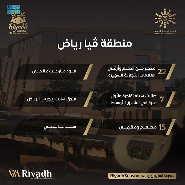 يستعد موسم الرياض 2022 لافتتاح منطقة “فيا رياض” إحدى أفخم وأرقى مناطق الموسم الـ 15 الترفيهية، حيث من المقرر أن تكون من المناطق الدائمة في العاصمة الرياض على غرار منطقة “بوليفارد رياض سيتي”.