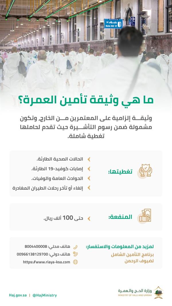 وأكدت أن تلك الوثيقة إلزامية على معتمري الخارج، وتكون مشمولة ضمن رسوم التأشيرة، إذ تقدم لحاملها تغطية شاملة.