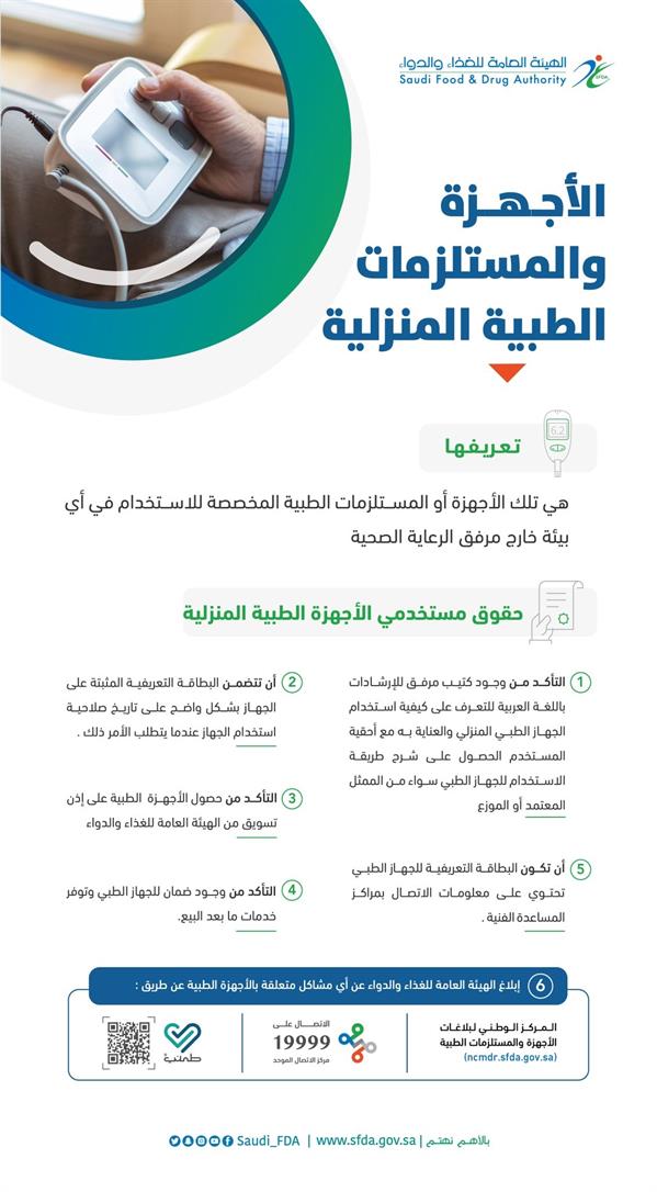 أوضحت الهيئة العامة للغذاء والدواء، حقوق مُستخدمي الأجهزة والمستلزمات الطبية المنزلية، ومنها التأكد من وجود تاريخ الصلاحية على عبوات بعض الأجهزة قبل الاستخدام.