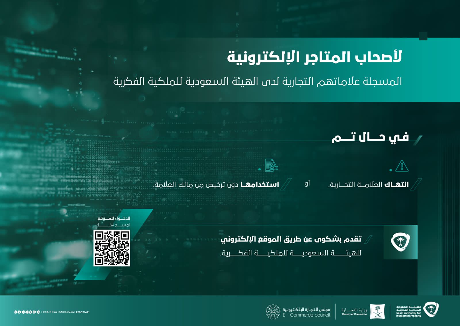 أوضحت الهيئة السعودية للملكية الفكرية عن إجراءات تقديم الشكوى لأصحاب المتاجر الإلكترونية المسجلة علاماتها التجارية لدى الهيئة في حال انتهاكها أو استخدامها من الغير دون ترخيص مسبق من مالك العلامة .