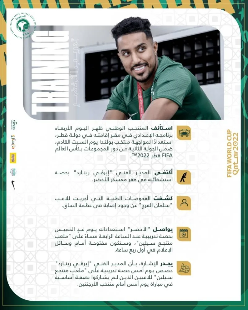 من جهة أخرى، كشفت الفحوصات الطبية التي أجريت للاعب سلمان الفرج عن وجود إصابة في عظمة الساق، بعد خروجه اضطرارياً في لقاء الأرجنتنين.