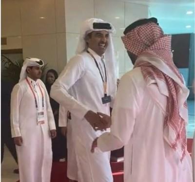 وأظهر مقطع فيديو الشيخ تميم يصافح الأمير عبدالعزيز اليوم (الأربعاء) في الملعب؛ ومن ثم سأله قائلاً: “كيف النومة أمس؟”.
