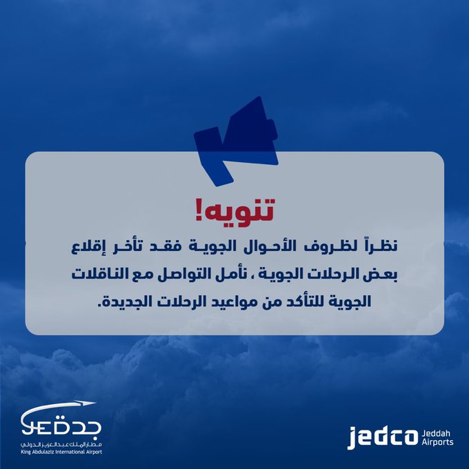 أعلنت إدارة مطار الملك عبدالعزيز الدولي بجدة عن تأخر إقلاع بعض الرحلات الجوية بسبب الحالة المطرية التي تتعرض لها المنطقة.