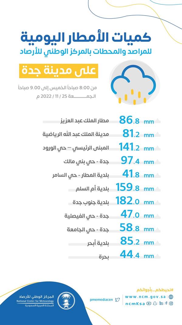 ونشر المركز تفاصيل كميات الأمطار الهاطلة بجدة خلال الـ24 ساعة الماضية، وفقاً لمحطات الرصد بالمحافظة، والتي أظهرت تسجيل بلدية جنوب جدة لأعلى معدل أمطار بـ 182 ملم.