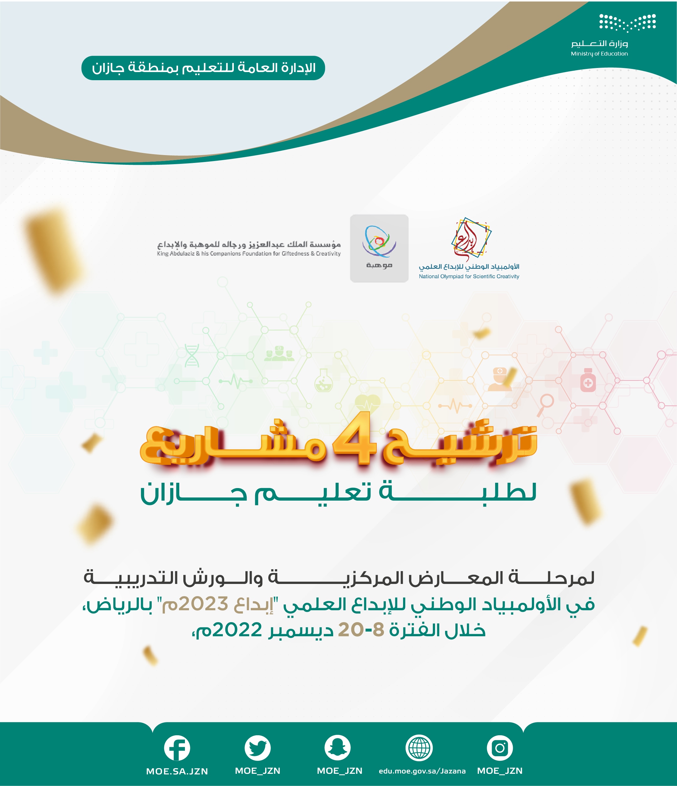 تأهلت أربعة مشاريع من الإدارة العامة للتعليم بمنطقة جازان للمشاركة في المرحلة ما قبل النهائية “المعارض المركزية والورش التدريبية” في منافسات الأولمبياد الوطني للإبداع العلمي “إبداع 2023″، على مستوى وزارة التعليم بعد تفوقهم على 146 ألفًا من أقرانهم سعياً لتمثيل المملكة في آيسف 2023م ، بالشراكة مع مؤسسة الملك عبدالعزيز ورجاله للموهبة والإبداع “موهبة”.