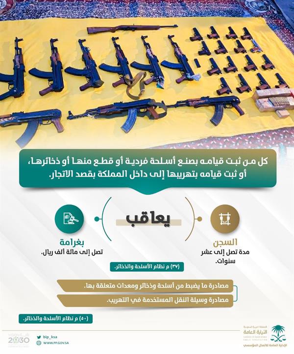 أكّدت النيابة العامة أنه يحظر صنع الأسلحـة الفردية أو قطعها أو ذخائرها، أو تهريب أي من ذلك إلى داخل المملكة بقصد الاتجار، مبينةً العقوبات المقررة نظاماً لتلك الجرائم.