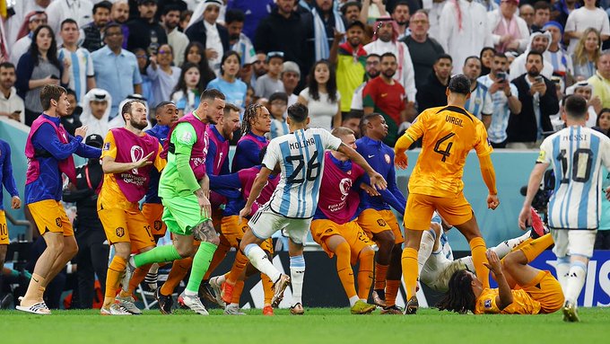 مشادة واشتباك بين لاعبي #هولندا و #الأرجنتين في ربع نهائي مونديال قطر#قطر2022 #كاس_العالم_قطر_2022 #قنوات_الكاس #Qatar2022 #FIFAWorldCup @OnsOranje @Argentina @afa #TodosJuntos #Argentina #NothingLikeOranje pic.twitter.com/NtiOyE0ZmC